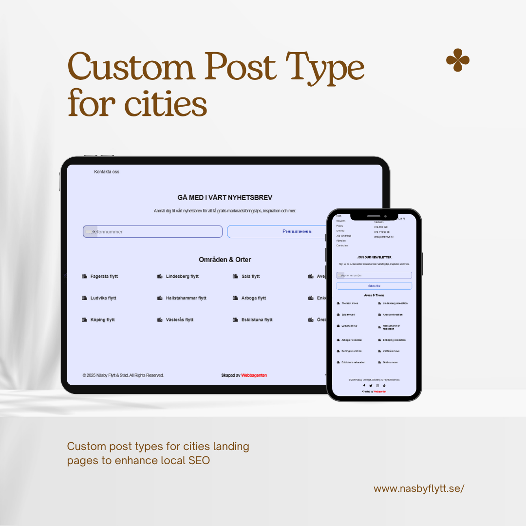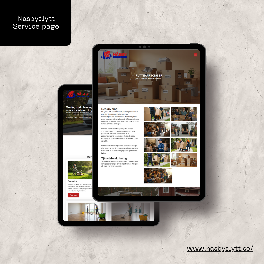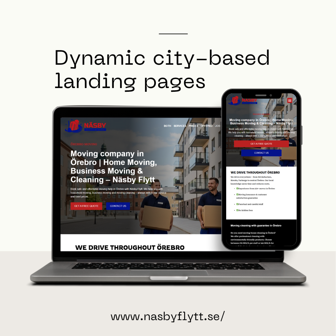 Näsby Flytt is a professional moving and cleaning company in Sweden. The website was built to highlight their relocation services through a clear, conversion-focused structure. Each service and city page was dynamically generated using JetEngine’s custom post types and meta fields — providing localized SEO and unique content per city. The site emphasizes trust and convenience, with easy-to-use forms, bilingual content (Swedish/English), and strong visual branding that communicates reliability and professionalism.